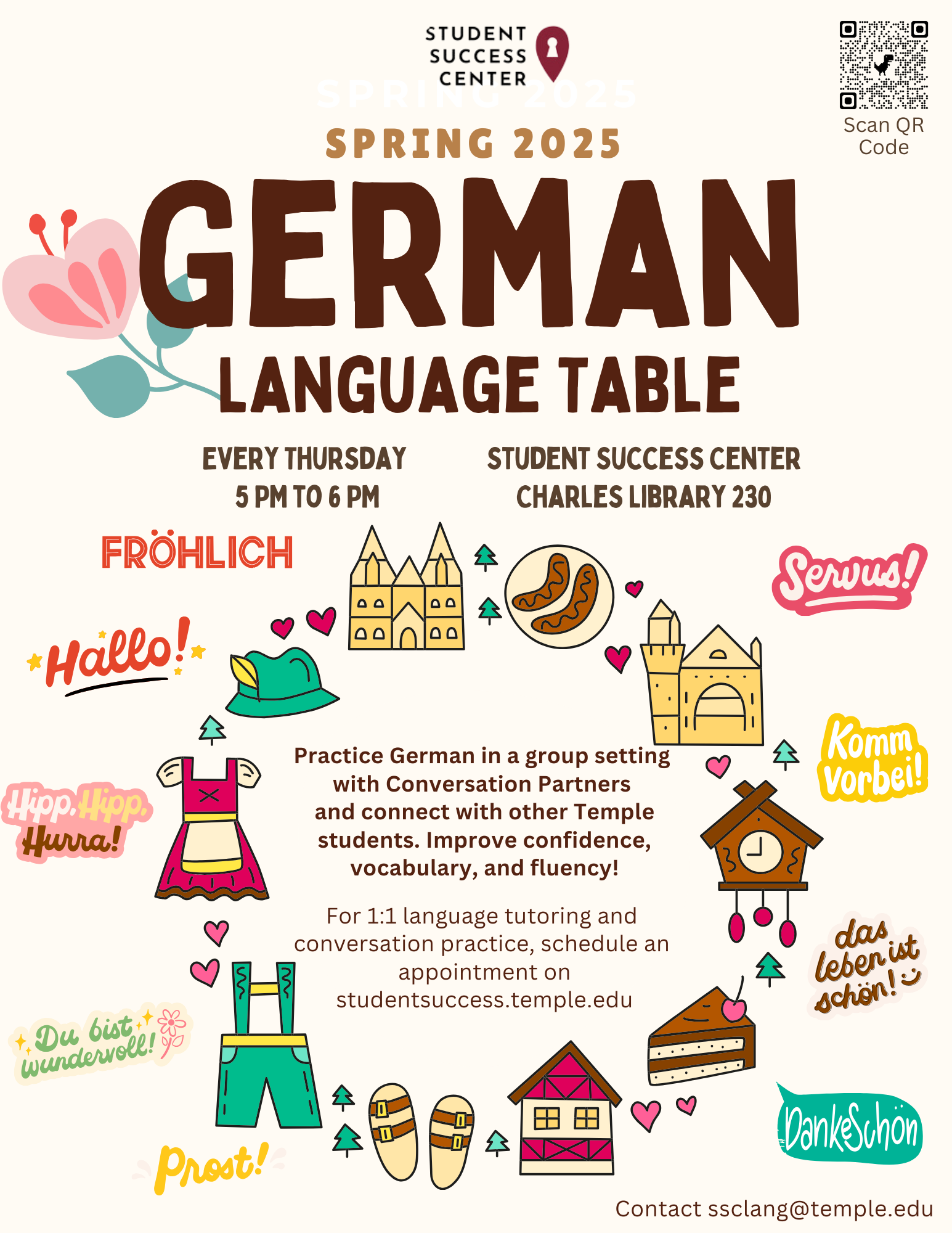 In Spring 2025, we will have weekly tables in Charles 230 for Arabic, American Sign Language, Chinese, English, French, German, Hindi, Italian, Japanese, Korean, Portuguese, Russian, and Spanish. See the schedule below!